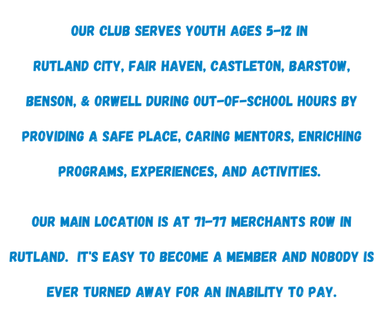 Our clubs serves youth ages 5-12 in All sites: Rutland city, Rutland Town, West Rutland, Proctor, Neshobe, Lothrop, MSES, Wells, Poultney, Castleton, Fair Haven, Benson & Orwell. During out of school hours by provided a safe place, care mentors, enriching programs, experiences and activities. Our Rutland City Location Has started a New Teen center Called “The Hangout Spot” Located at 71 Merchants Row Rutland.
